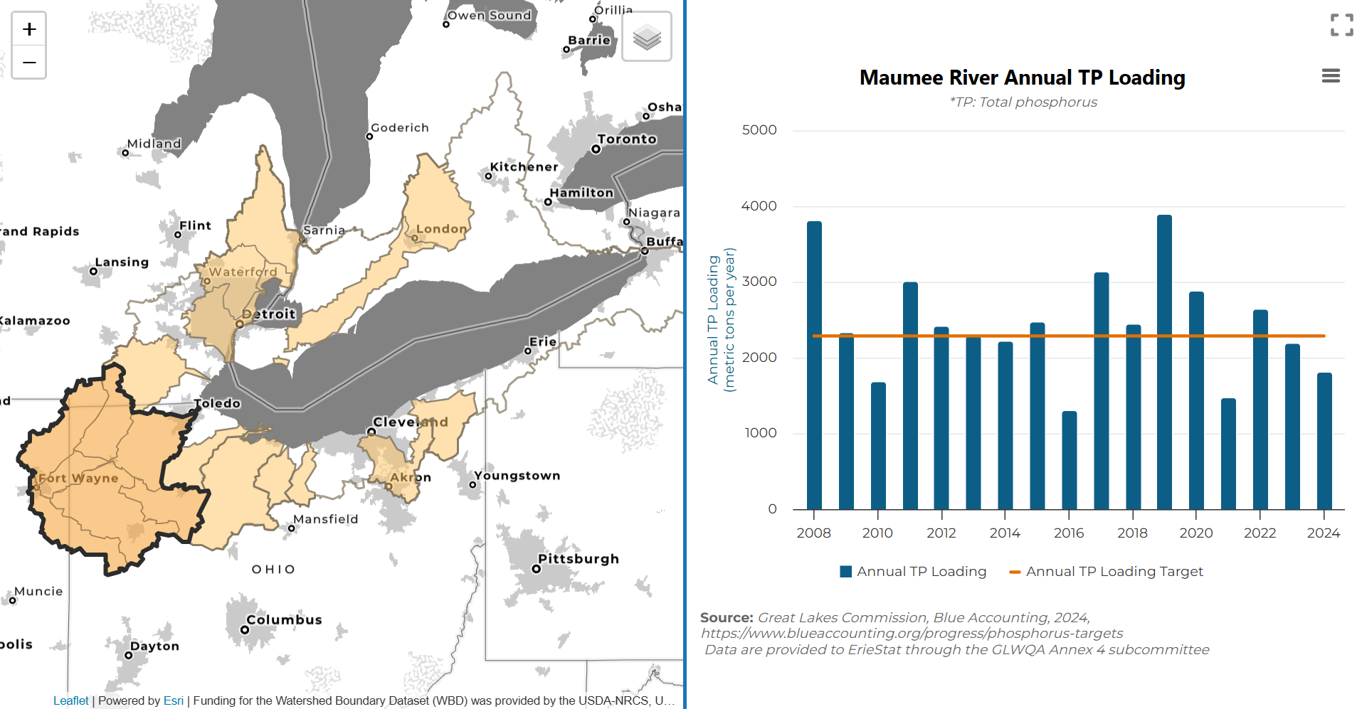 The U.S. and Canada agreed to limit the total phosphorus (TP) load to Lake Erie’s central basin, which includes inputs from the St. Clair-Detroit River corridor, to 6,000 metric tons per year (MTA). This was based on modeling of the hypoxic (low oxygen) zone in the lake. The modeling indicated that 6,000 MTA is the maximum load that would result in an acceptable dissolved oxygen concentration of at least 2 milligrams per liter in the bottom waters during the summer stratified period. This means that during the warmest months of the year, oxygen in Lake Erie’s water would be high enough to reduce the “dead zone” that has been cause for concern in recent years. Ten priority watersheds were identified and assigned a target to reduce annual total phosphorus loads to 40 percent of the 2008 load, by water year (October-September). With the exception of the Detroit River connecting channel, these loads are estimated at the mouth of the tributary, using three pieces of information: 1) water quality monitoring data collected at the most downstream stream gage for the river; 2) reported data for point source dischargers beyond this point; an 3) an estimate for the unmonitored area beyond the gage, using a simple ratio for unit-area load. The Detroit River is not monitored directly; instead the load is computed as a sum of upstream tributary loadings and point source discharges. Click on the watershed of interest to see available data.